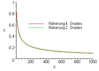 Den Durchmesser d erhält man im Phong-Modell mit Spekularexponent n aus Pi / 4 = Integral(Integral((n + 1) / (2 * Pi) * cos(a)n * a, a=0..d/2), 0..2*Pi). Entwickelt man cos(a)n als Reihe, so erhält man in quadratischer Näherung cos(a)n = 1 - n / 2 * x2, und somit Pi / 4 = -1/128 * (n + 1) * n * d4 + 1/8 * (n + 1) * d2 mit der Lösung d = 2 * sqrt((2 * n + 2 + sqrt(4*n2 + 8 * n + 4 - 2 * Pi * n2 - 2 * n * Pi)) / ((n + 1) * n)). Diese kann für n >> 1 gut über d = 3 / sqrt(n) angenähert werden.