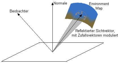 Für die Nachbildung von Spiegelungen wird das einfallende Licht einer Environment Map entnommen. Um verschieden rauhe Oberflächen zu simulieren wird dazu der reflektierte Sichtvektor mit zufälligen Vektoren so moduliert, daß der endgültige Reflexionsvektor derselben Verteilung folgt wie der Intensitätsverlauf eines spekular reflektierten Lichtes aus derselben Richtung. Hierbei genügt es, nur ein einzigen Wert pro Pixel aus der Environmentmap auszulesen, da das dadurch erzeugte Muster sich optisch kaum von der Streuung des simulierten Airbrushes unterscheidet. Vorraussetzung dazu ist allerdings eine ausreichend tiefpaßgefilterte Environment Map, da starke Änderungen der Farbe innerhalb eines Winkels in Größenordnung des Streukegels des modulierten Reflexionsvektors zu einem unruhigen Gesamtbild führen würden.