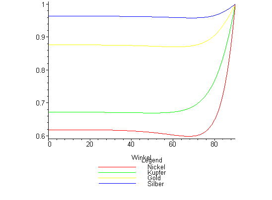 Hier lassen sich zwei wichtige und zudem polarisationsunabhängige Eigenschaften ablesen: Erstens geht der Betrag des Reflexionskoeffizienten für flachen Lichteinfall gegen 1, wodurch das gesamte einfallende Licht unabhängig von der Farbe reflektiert wird. Zweitens beträgt der Reflexionskoeffizient für senkrechten Lichteinfall (n - 1) / (n + 1), so daß Farbe und Intensität des reflektierten Lichts nur vom frequenzabhängigen Brechungsindex abhängen.
