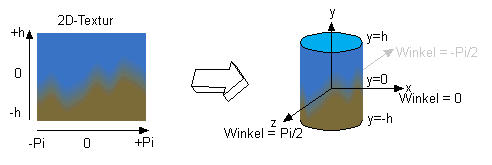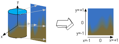 //Parameter float XzuY; //Seitenverhältnis der eingesetzten Textur float4 Envmap_Zylinder(float3 Richtung) { //zylindrische Textur, Breite:Höhe = 2:1 //Addressmodi: x=wrap, y=clamp float2 TexKoord; TexKoord.x = 1 - (atan2(Richtung.x,Richtung.z) / (2 * PI)); TexKoord.y = 0.5 * (1 - XzuY * Richtung.y / sqrt((1 - Richtung.y * Richtung.y))); return tex2D(EnvMap,TexKoord); }